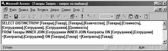 Если запрос строится на основе полей из нескольких связанных между собой таблиц, то это, естественно, усложняет программу, в которой нужно обеспечить определенное согласование отбираемых для запроса данных. В частности, в более сложном запросе «Товары Запрос», основанном на трех взаимосвязанных таблицах «Товары», «Контракты» и «Сотрудники», появляются операторы INNER JOIN (внутреннее объединение, англ.) для внутреннего объединения таблиц по связующему их полю и DISTINCTROW (отличающаяся запись, англ.) для ограничения выбираемых данных однозначными записями (см. рис. 28).