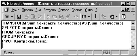 Перекрестный запрос всегда преобразует таблицу запроса к форме электронных таблиц Excel, поэтому первым оператором в таком запросе является оператор TRANSFORM (преобразовать, англ.), который определяет вычисляемые значения в ячейках результирующей таблицы запроса. После операторов выбора SELECT … FROM и оператора группировки GROUP BY следует оператор PIVOT (опора, англ.), где указывается поле, которое должно использоваться при создании заголовков