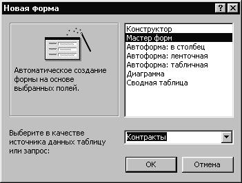 Выберите Мастер форм и нажмите кнопку ОК. Из раскрывающегося списка Выбор таблицы/запроса выберите таблицу «Контракты», после чего нажмите кнопку ОК в соответствующем диалоговом окне (см. рис. 22). В результате на экране появится диалоговое окно, аналогичное окну (см. рис. 14), открываемому Access при создании запроса, где предлагается выбрать таблицы и поля из них, которые необходимо включить в состав создаваемой формы. Выберите все поля таблицы для отображения их на форме.