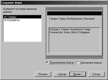 Чтобы использовать возможности Мастера форм в полной мере, в этом же окне добавьте к создаваемой форме поля из связанной с таблицей «Контракты» таблицы «Товары»: «Товар», «Изображение», «Описание», что позволит создать вложенные друг в друга формы, т.н. форму с подчиненной формой. Далее на следующем шаге работы Мастера открывается диалоговое окно, в котором необходимо выбрать тип представления данных. Поскольку по организации связи между таблицами таблица «Товары» является главной (см. схему связей для нашей БД на рис. 10), то, выбрав тип представления данных по Товары, получим форму с подчиненной формой (см. рис. 32).