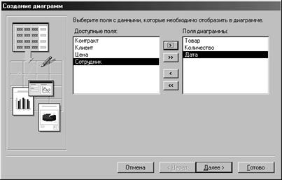 Данные для диаграммы, отражающей динамику, содержатся в полях «Дата», «Количество». Перенесите эти поля, а также поле «Товар» в окно Поля диаграммы, после чего нажмите кнопку Далее в диалоговом окне.
