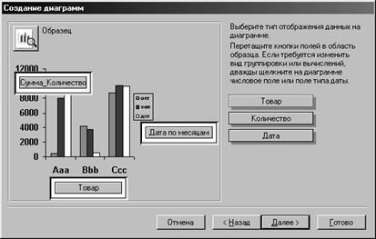 В новом диалоговом окне необходимо выбрать тип диаграммы. После чего появляется образец будущей диаграммы, причем ориентируясь на подсказки в диалоговом окне (см. рис. 34), можно изменять предлагаемые установки для различных компонент диаграммы. Например, дважды щелкнув мышью по полю «Сумма_количество», можно применить к этому числовому полю диаграммы другую операцию группировки: Среднее, Минимум, Максимум и т.п., а для поля с датой можно выбрать группировку дат по неделям, кварталам и т.п.