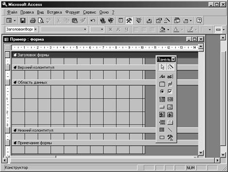 В созданной форме содержимое областей Заголовка и Примечания формы, а также Верхнего и Нижнего колонтитулов не изменяется при перемещении по записям БД, которые располагаются в Области данных. Причем обычно в формах используется только Область данных, а остальные области заполняются для специальных целей: при выводе на печать, для пояснений и комментариев данных и т.п. Необходимо отметить также, что по умолчанию при создании новой формы в режиме Конструктор на экране появляется только Область данных, разбитая на квадраты сеткой, и Панель элементов.