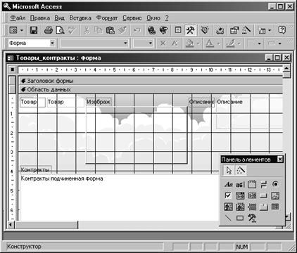 Отредактируйте с помощью Конструктора созданную ранее форму «Товары_контракты». Для этого откройте эту форму в режиме Конструктор, выполнив команды Формы/Конструктор, после чего на экране появится форма «Товары_контракты» в виде, представленном на рис. 36.