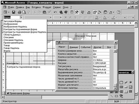 Измените фоновый рисунок формы, для чего вызовите контекстное меню для формы щелчком по правой кнопке мыши после выбора объекта формы вне областей, где размещаются элементы управления, т.е. вне сетки формы, и выполните команду Свойства/Макет/Рисунок…. Эту же команду можно выполнить, выбрав в списке в левом углу пиктографического меню Формат (форма/отчет) объект Форма и затем нажав кнопку Свойства на пиктографическом меню Конструктор форм (см. рис. 37).