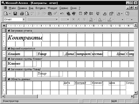 При проектировании отчетов в значительной мере используются те же технологии, что при проектировании форм, однако, в отличие от форм, пользователю в отчетах не разрешается менять данные. При редактировании отчетов в режиме Конструктор (см. рис. 42) используются те же области интерфейса, что и при редактировании формы – области Заголовка и Примечания, области Верхнего и Нижнего колонтитулов, Область данных.
