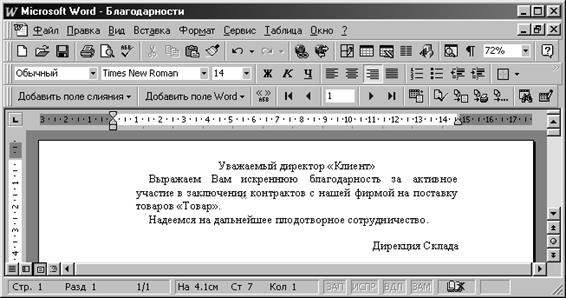 Подготовьте серийное письмо с содержанием, представленным на рис. 43. Выделенные кавычками названия полей вводятся в последовательно соответствующее место текста письма из списка, который необходимо раскрыть щелчком мыши по пиктограмме Добавить поле слияния (см. рис. 43). В списке должны быть перечислены все поля созданного запроса «Благодарности», в том числе и необходимые нам поля «Клиенты» и «Товары». После щелчка мышью по пиктограмме Поля/Данные и используя кнопки прокрутки значения полей из таблицы запроса БД, можно предварительно просмотреть подготовленные к печати письма.