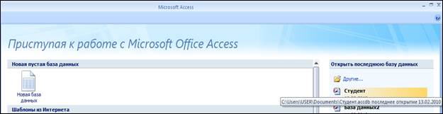 Порядок выполнения работы.Откройте базу данных «Студент» (рис._1). Если имя файла не указано в разделе «Открыть последнюю базу данных», то найдите файл базы данных в папке, где она была сохранена.