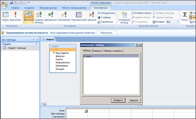 Добавьте в запрос таблицу «Студент» (рис. 3) и закройте диалоговое окно «Добавление таблицы». В итоге получим пустой бланк запроса (рис. 4).