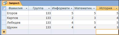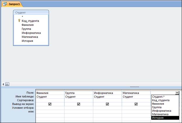 Добавьте необходимые поля в бланк запроса: «Фамилия»; «Группа»; «Информатика»; «Математика»; «История». Добавление выполняется путем выбора из списка (рис. 5). Имя таблицы в бланке запроса вставляется автоматически. По умолчанию устанавливается режим вывода на экран результатов поиска по каждому полю.