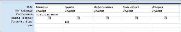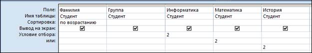 Условие поиска студентов, которые получили в сессии неудовлетворительные оценки, следующее: «Информатика» равно 2 или «Математика» равно 2 или «История» равно 2. В этом случае простые условия отбора записываются в разных строках (рис. 11).