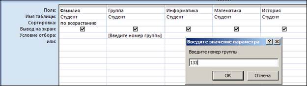 Если необходимо регулярно выполнять поиск студентов различных групп, то более эффективным является запрос с параметром. В этом случае конкретное значение вводится при выполнении запроса. Бланк подобного запроса и диалоговое окно ввода значения параметра представлены на рис. 9.