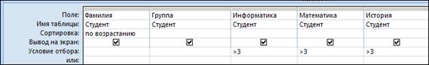 Создание сложного запроса. Поиск студентов, сдавших сессию без троек. Оценки студентов в этом случае должны удовлетворять условию: «Информатика» больше 3 и «Математика» больше 3 и «История» больше 3. Составные части сложного запроса – простые условия отбора соединены союзом и, т.е. должны выполняться одновременно. Для этого в бланке запроса условия отбора должны быть записаны в одной строке (рис. 10).