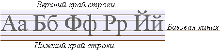 Базовая линия - это линия, на которой располагаются "сидят" символы в текстовой строке, Например буква "А" сидит прямо на этой линии, а вот строчная буква "у" сидит на ней же, но свесив ноги..