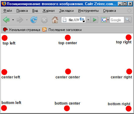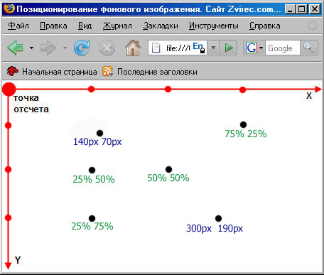 Задает позицию фонового изображения. Значения можно задавать в процентах, в единицах длины и при помощи ключевых слов. Отсчет как обычно ведется из левого верхнего угла браузера, где и располагается фоновое изображение по умолчанию. На рисунке приведены примеры позиционирования(точка это типа изображение, а то что под ней - приблизительные координаты)