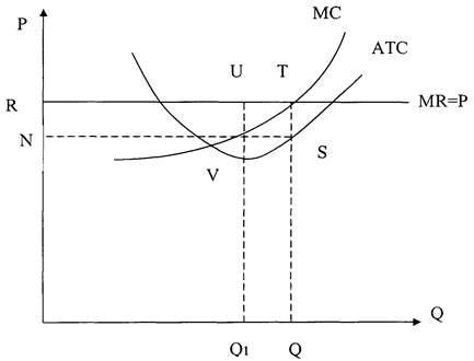 Производство в условиях равновесия составляет Q, потому что в точке Т предельные издержки равны рыночной цене на товар MR = MC. Максимум чистой прибыли представлен площадью NRTS как разница между общим доходом (TR total revenue) (площадь прямоугольника ORTQ) и общими издержками (TC total cost) (площадь ONSQ). Нетрудно догадаться, что в положении равновесия нет максимума прибыли на единицу продукции. Этот максимум измеряется разницей между средним доходом и средними издержками. Максимум прибыли на единицу продукции показан для производства Q1 и измеряется отрезком UV. В точке V находится минимум средних общих издержек (АТС), в ней, таким образом, достигается лучшая из возможных комбинаций постоянных и переменных факторов производства. Следовательно, при цене более высокой по сравнению с минимальными общими средними издержками данная фирма расширяет производство выше точки оптимальной комбинации факторов производства. В итоге равновесие достигается только тогда, когда предельные издержки возрастают.
