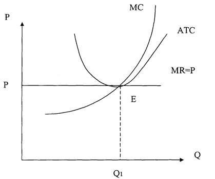 Имеется лишь один случай, когда фирма достигает положения равновесия в коротком периоде в точке оптимальной комбинации факторов производства. Это происходит, когда линия цены является касательной к кривой общих средних издержек в точке минимума последней (рис. 4.3). В этом положении фирма не имеет чистой прибыли, а получает только нормальную прибыль, поскольку цена и средние полные (включающие нормальную прибыль) издержки равны друг другу.
