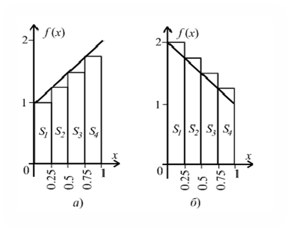 В зависимости от свойств интегрируемой функции можно применять метод левых или правых прямоугольников. Отличие этих методов состоит в том, с какой стороны на интервале интегрирования начинают строить прямоугольники. На рис. 2.а показан метод левых прямоугольников. Большие стороны каждого прямоугольника рассчитываются, двигаясь слева направо, относительно точек x1=0, x2=0.25, x3=0.5, x4=0.75.