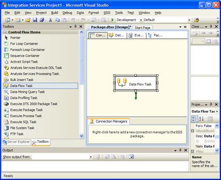 Шаг 1.Сначала визуализируем панель ToolBox, на которой находятся различные Control Flow Items (элементы), в том числе и Data Flow Task.