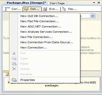 Шаг 2.Соединение с источником данных. Перейти на вкладку Data Flow и с помощью объектов Connection Manager создается соединение с источником данных.