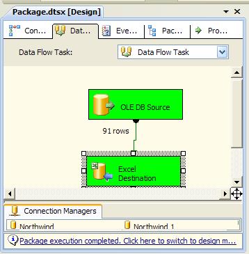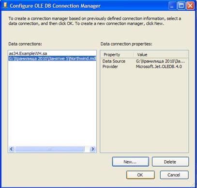 В нашей задаче необходимо два подключения: одно с базе данных Northwind.mdb, как к источнику данных и второе к Excel таблице, как к «стоку» данных (Excel Connection Manager). Для этого на объекте Connection Managers надо щелкнуть мышью дважды, выбрать New Connection и задать параметры соединения (провайдера и имя источника).