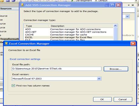 Выбрать в качестве источника EXCEL (Connection manager for Excel files), определить место размещения Excel-книги и указать тип книги.