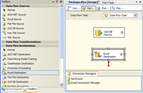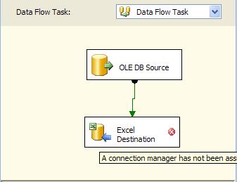 Шаг 4. Создание связи между объектом OLE DB Source и элементом Excel Destination. Это делается мышкой путем выделения объекта OLE DB Source, захвата зеленой стрелки и перетаскивания ее на объект Excel Destination.