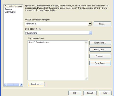 При редактирование источника данных откроется окно OLE DB Source Editor с тремя вкладками, на которых надо задать нужные параметры. Здесь же, используя кнопку Build Query, можно построить SQL запрос, который будет выбирать из таблиц источника нужные данные.