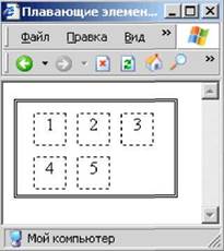 Создадим пример с несколькими плавающими блоками. Зададим основной контейнер с фиксированной шириной, а в него поместим пять плавающих блоков с выравниванием по левому краю.