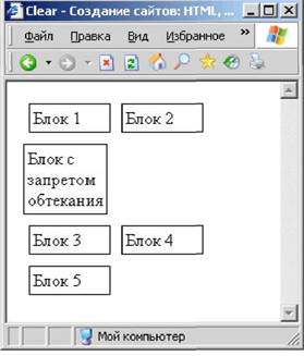 Еще одним свойством, связанным с плавающими элементами, является clear, Clear запрещает обтекание элемента с левой (left), правой (right) или с обеих сторон (both). По умолчанию значение - попе - обтекание разрешено. Рассмотрим пример: