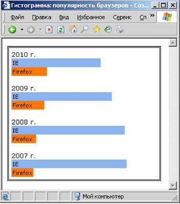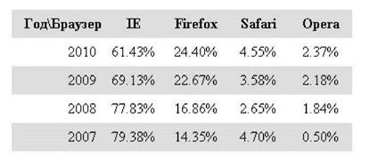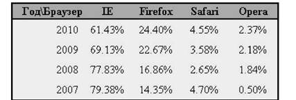 6) На основе данных о популярности браузеров за 2010 год создайте столбчатую диаграмму (гистограмму). Пример показан на рис. 11.
