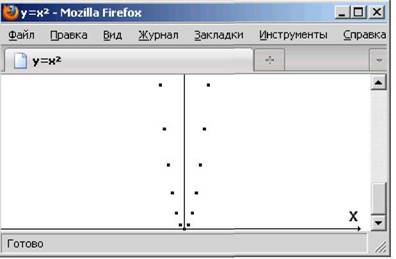 12*) Посредством абсолютного позиционирования изобразите точечный график математической функции. Пример для у=х2 показан на рис. 15. Указание: Создайте изображение с нарисованными на нем осями X и Y. Поверх него поместите точки графика абсолютным позиционированием.