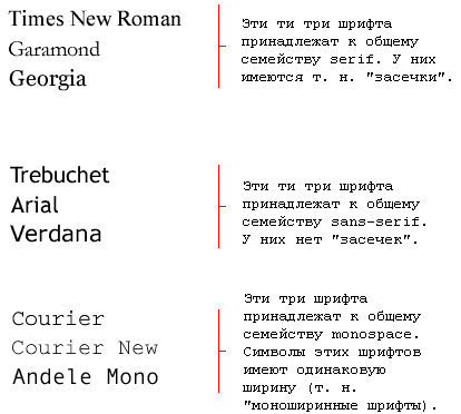 При указании шрифтов для вашего web-сайта вы, естественно, начинаете с предпочтительного шрифта, а затем перечисляете альтернативные. Рекомендуем в конце списка указывать родовое имя. Тогда страница, как минимум, будет отображена шрифтом того же семейства, если отсутствуют все специфицированные конкретные шрифты.