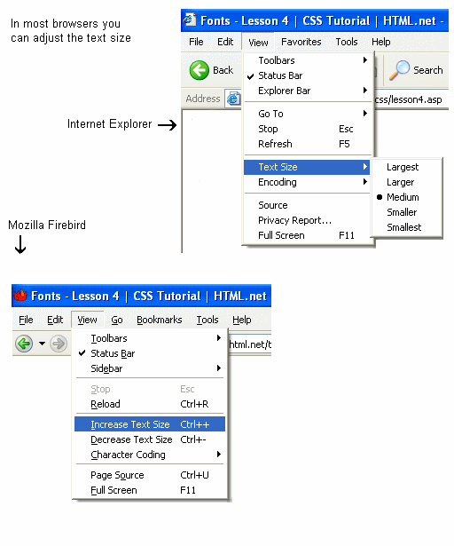 Вот иллюстрация того, как настроить размер шрифта в Mozilla Firefox и Internet Explorer. Попробуйте сами - прекрасное свойство, как вы полагаете?