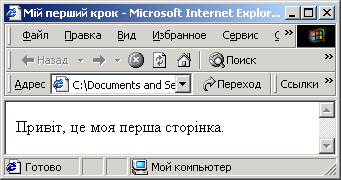 Треба набрати цей текст будь-яким редактором (наприклад, "Блокнот"), зберегти його з довільним іменем, але обов'язково з розширенням .html або .htm (наприклад, prikladl.html). Якщо тепер відкрити програму Internet Explorer i виконати команду "Файл" -> "Открыть" -> кнопка "Обзор..." -> prikladl.html, на екрані броузера цей HTML-файл буде мати наведений вигляд (Рисунок 1) (зверніть увагу на розташування текстів "Мій перший крок" i "Привіт, це моя перша сторінка").