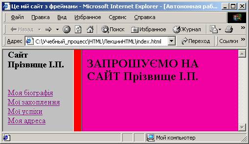 5. Складіть файл для опису правого фрейму. Він має вигляд початковою сторінки сайту, наприклад, слідуючого змісту: Запрошуємо на сайт Прізвище І.П.