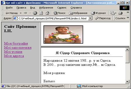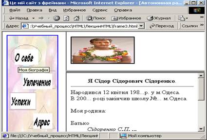 Поділіть правий фрейм на два горизонтальних фрейма. У вузькому верхньому фреймі розташуйте особисту емблему з деякого графічного файлу або фотографію. Як це зробили?
