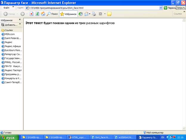 Он служит для указания типа шрифта, которым броузер пользователя будет выводить текст. Тип шрифта соответствует его названию. Если на компьютере пользователя нет шрифта, соответствующего заданному параметром FACE , текст ему будет показан стандартным (по умолчанию) шрифтом. Чтобы избежать подобной ситуации, можно указать несколько названий шрифтов, разделяя их запятыми. При этом список шрифтов будет просматриваться слева направо.