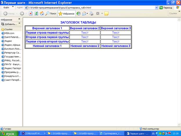 Каждая группа должна иметь хоть одну строку и одинаковое количество столбцов. Такое группирование позволяет делать прокрутку только содержимого таблицы с помощью полосы прокрутки, не меняя положения заголовков на экране, что удобно для вывода длинных таблиц.