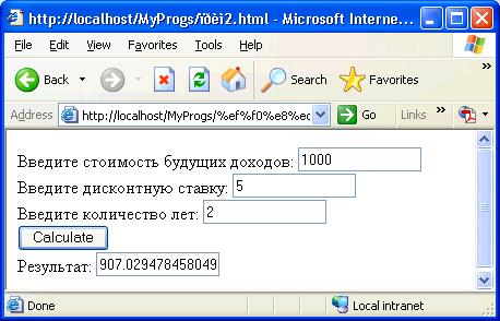 В начале данной программы создается JavaScript, где определяется функция compute(), принимающая значение form. В данной функции идет проверка условия - выводится на экран окно сообщения, в котором необходимо подтвердить выполнение расчетов. Далее, рассчитывается стоимость инвестиций, которая будет записана в элемент формы с именем result.