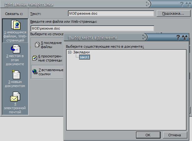 · дальнейшие действия зависят от конкретной вкладки, указанной в предыдущем пункте. Если выбирали «связать с имеющимся файлом», то справа нажимаете на кнопку файл и выбираете нужный файл. Если - «с местом в этом документе», то при нажатии этой вкладки справа высветится список с имеющихся закладок, выбираете то название, которое вводили в строке Имя закладки и нажимаете <ОК> - гиперссылка готова.