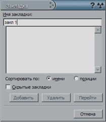 · в строке Имя закладки введите сочетание символов, например Закл1