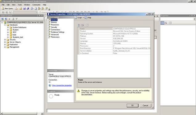 Рассмотрим этот программный продукт более подробно. Эта программа предназначена для администрирования Microsoft SQL Server 2005. С ее помощью можно настраивать параметры самого SQL Server (соединение, используемые ресурсы, безопасность и т.д. - рис. 1), администрировать / создавать / удалять БД (рис.2, 3, 4); изменять привилегии и пароли существующих пользователей / создавать новых пользователей / удалять существующих пользователей (см. рис. 5, 6, 7, 8); разрабатывать и выполнять SQL запросы (рис. 9) и многое другое.