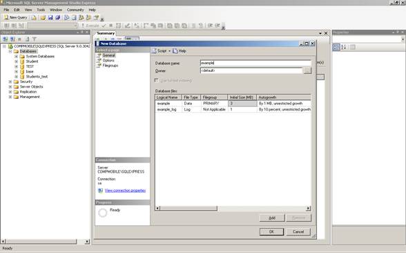 3. В первой вкладке содержатся окно ввода, в которое нужно ввести имя новой БД. В следующем окне ввода задается имя владельца создаваемой БД (по умолчанию – default - это текущий активный пользователь). Ниже находится окно, в котором задаются имена файла, содержащего БД, и лога транзакций, а также их начальный размер. По умолчанию их имена совпадают с именем базы данных, а расширения .mdf и .ldf, соответственно.