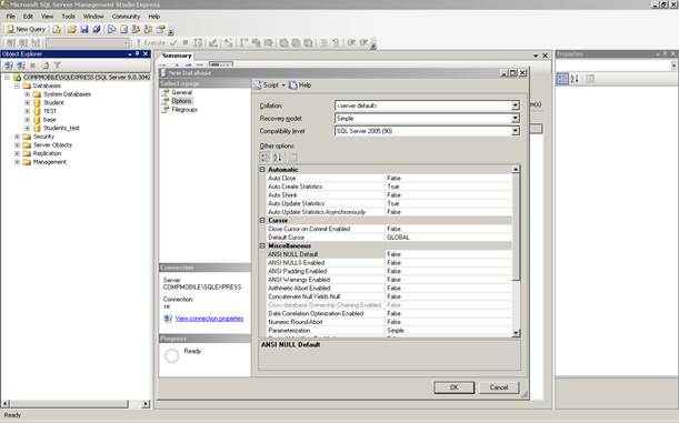 4. На 2-ой вкладке задаются свойства создаваемой БД (рис. 4). В первом окне находится выпадающий список collation names, представляющих собой языковые раскладки с описанием правил упорядочения символов в них. По умолчанию выбрана Server default (раскладка по умолчанию). В следующем окне задается режим (модель) восстановления данных. По умолчанию – simple, что означает отсутствие резервного копирования лога транзакций. В результате выбора такой модели восстановление данных возможно только с использованием последней резервной копии файлов данных. Такой режим восстановления полезен в случае, если данные в базе используются только для чтения, а также на этапе разработки и тестирования БД, т.к. минимизируются затраты по управлению резервным копированием лога транзакций (его резервное копирование вообще не производится). В следующем окне выбирается режим совместимости. По умолчанию – 90, что означает совместимость с Microsoft SQL Server 2005. Режим совместимости означает поддержку синтаксических возможностей той или иной версии MS SQL Server. Ниже идет перечень настраиваемых для БД параметров и их значения по умолчанию, которые можно изменять.