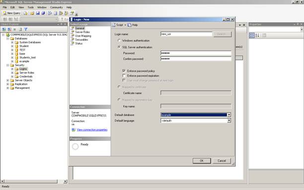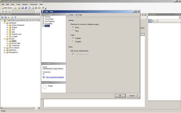По умолчанию активна только аутентификация Windows. Для того чтобы сделать доступной оба способа аутентификации необходимо либо в ключе реестра HKEY_LOCAL_MACHINE\SOFTWARE\Microsoft\MSSQLServer\MSSQLServer\LoginMode установить значение 0 или 2 и перезагрузиться; либо в Microsoft SQL Server Management Studio Express вызвать свойства соединения (рис. 1) и на вкладке Security и выбрать там смешанный способ аутентификации (SQL Server and Windows Authentication mode).