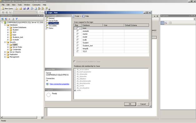 6. Вкладка User Mapping (рис. 7) позволяет тонкую настройку привилегий нового пользователя для каждой из существующих БД. Для того, чтобы пользователь имел доступ к БД нужно возле соответствующего имени БД в верхнем окне поставить галочку, что автоматически дает пользователю привилегию public (сама по себе не дает возможности выполнять SQL команды), иначе не будет возможности выбрать БД как текущую или обращаться к ее объектам. Следует обратить внимание, что к БД master пользователь имеет доступ в любом случае. Кроме привилегии public, которая не может быть сброшена, рассмотрим следующие привилегии (роли):