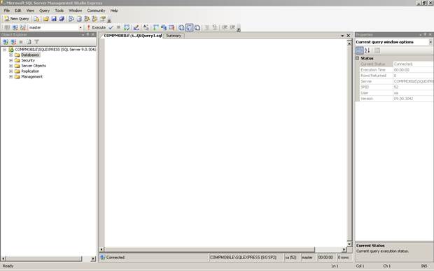 Пакет установки Microsoft SQL Server 2005 Express Edition не содержит никаких утилит для администрирования и написания SQL скриптов. Для этого необходимо установить Microsoft SQL Server Management Studio Express. Этот программный продукт включает в себя как возможности по администрированию, так и возможности по написанию SQL скриптов.