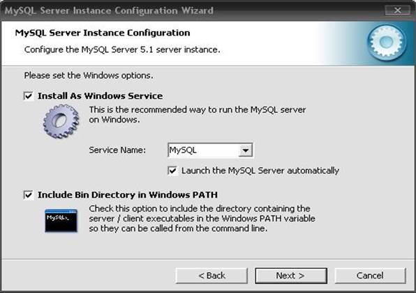 Если отметить “Install As Windows Service”, сервер будет запускаться в виде сервиса, что является рекомендуемым способом запуска. Ниже, в ниспадающем списке, задается имя сервиса. Далее, поставьте галочку рядом с “Launch the MySQL Server automatically”, чтобы он запускался автоматически. Также поставьте галочку рядом с “Include Bin Directory in Windows PATH” – это позволит установить видимость каталога “bin” для командной строки.