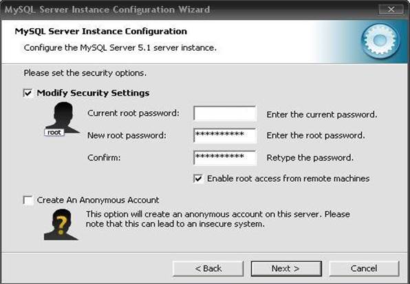 Установите пароль главного пользователя root. Не оставляйте это поле пустым, это убережет вас от возможных неприятностей в дальнейшем с безопасностью баз данных.